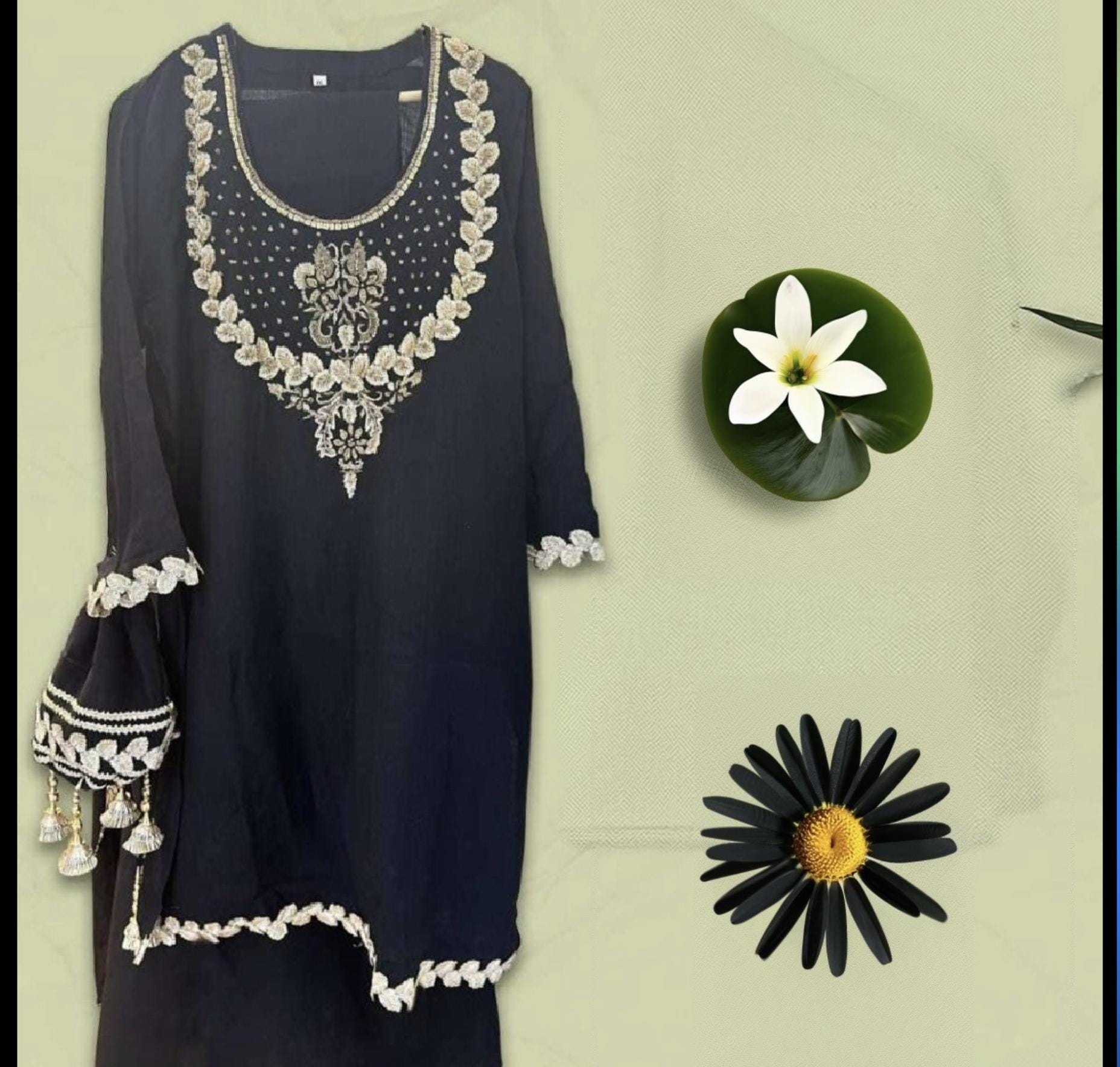 Add timeless elegance to your wardrobe with this stunning black kurti featuring intricate gold embroidery. Crafted from high-quality fabric, this kurti showcases a beautifully detailed neckline adorned with golden threadwork and embellishments, complemented by ornate sleeve and hem detailing with tassels for a regal touch.