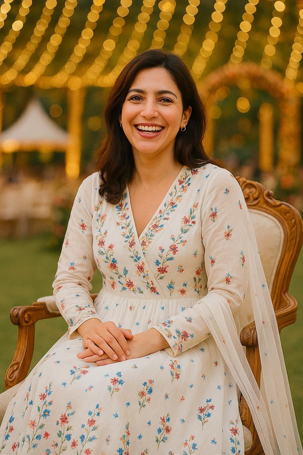 This ethereal white ensemble is adorned with delicate multicolored floral embroidery that brings out grace in every stitch. Lightweight, flowy, and perfect for any festive occasion or special gathering.