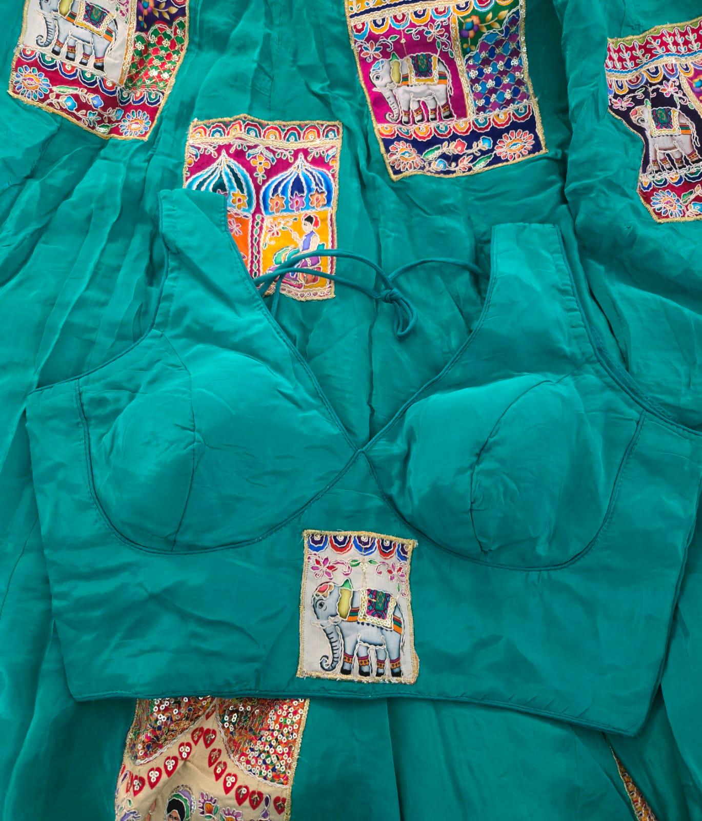 Garba Lehenga Pure Silk | Green Multicolored patches Ethnic Skirt | Navratri Ghagra Choli | Handmade Indian Festival Outfit 10 m flair