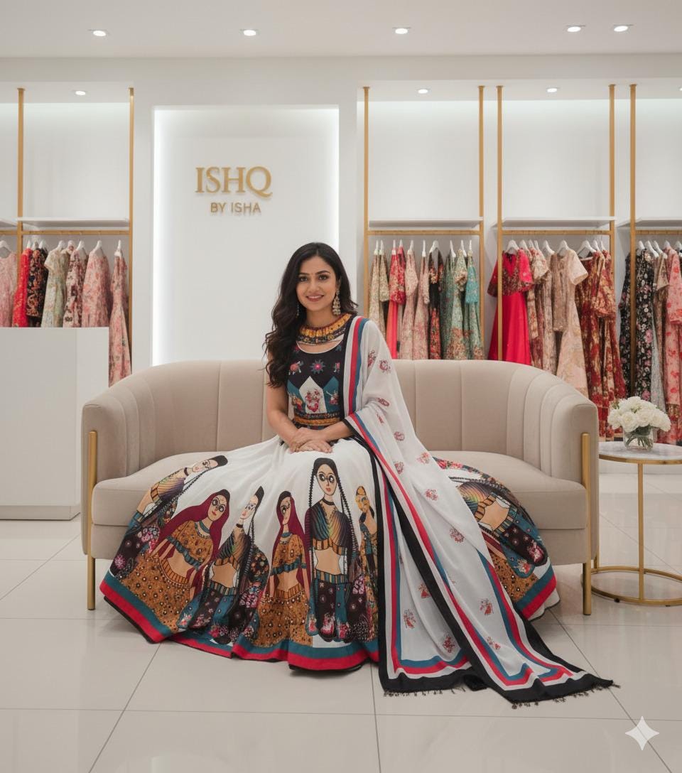 Celebrate the spirit of Navratri with this handcrafted rayon cotton Print Lengha in a stunning white base adorned with vibrant multicolored patterns. Perfect for Garba nights, dandiya raas, or any festive occasion, this outfit is a blend of traditional craft and contemporary style.